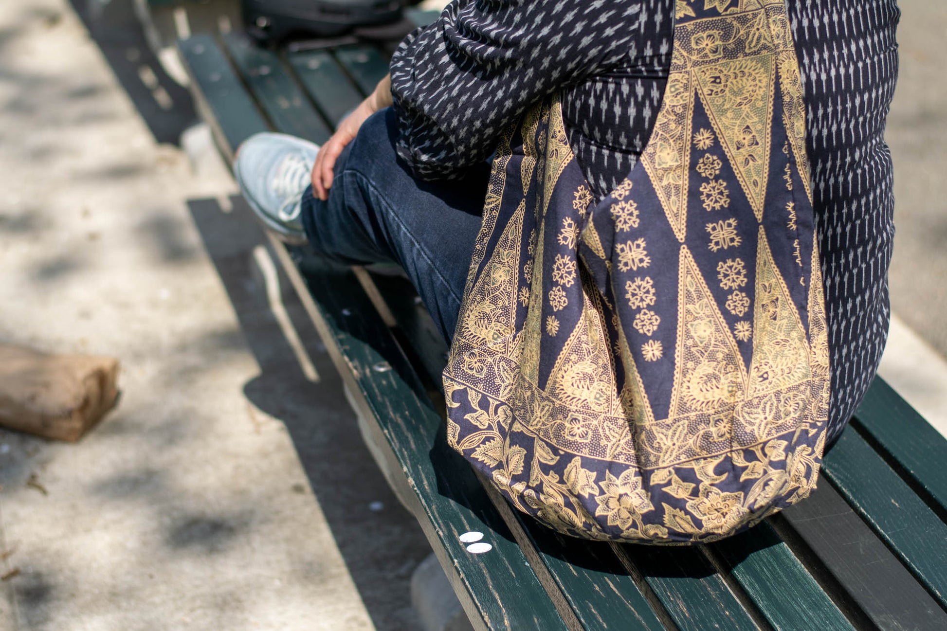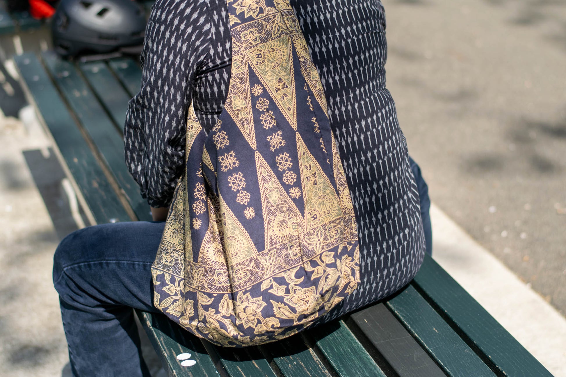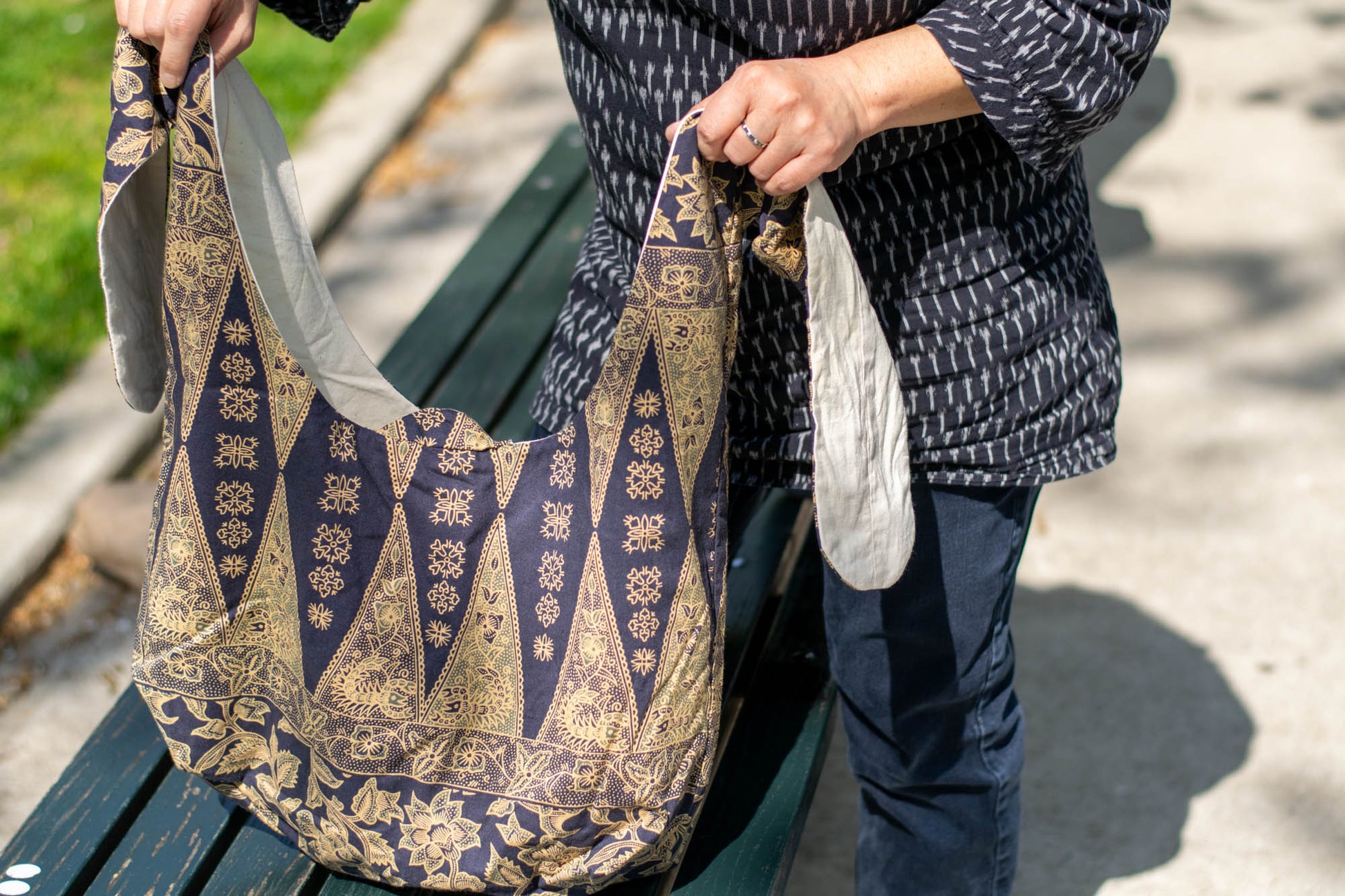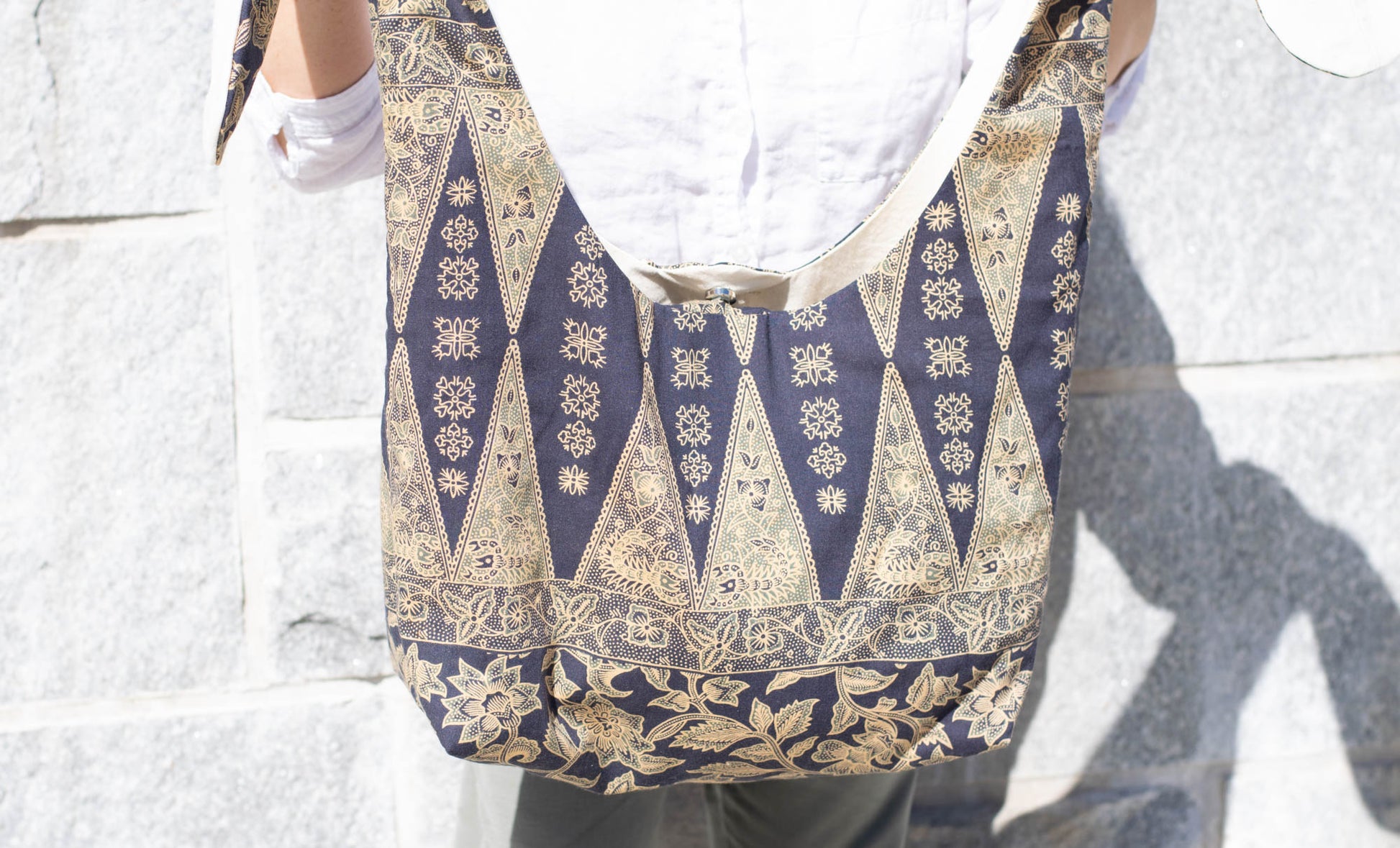 Reversible Shoulder Tie Sac Made from Salvaged Fabric — Dark Blue and Beige Botanical